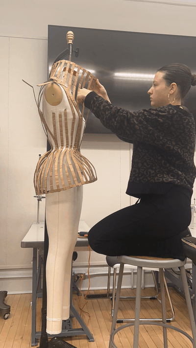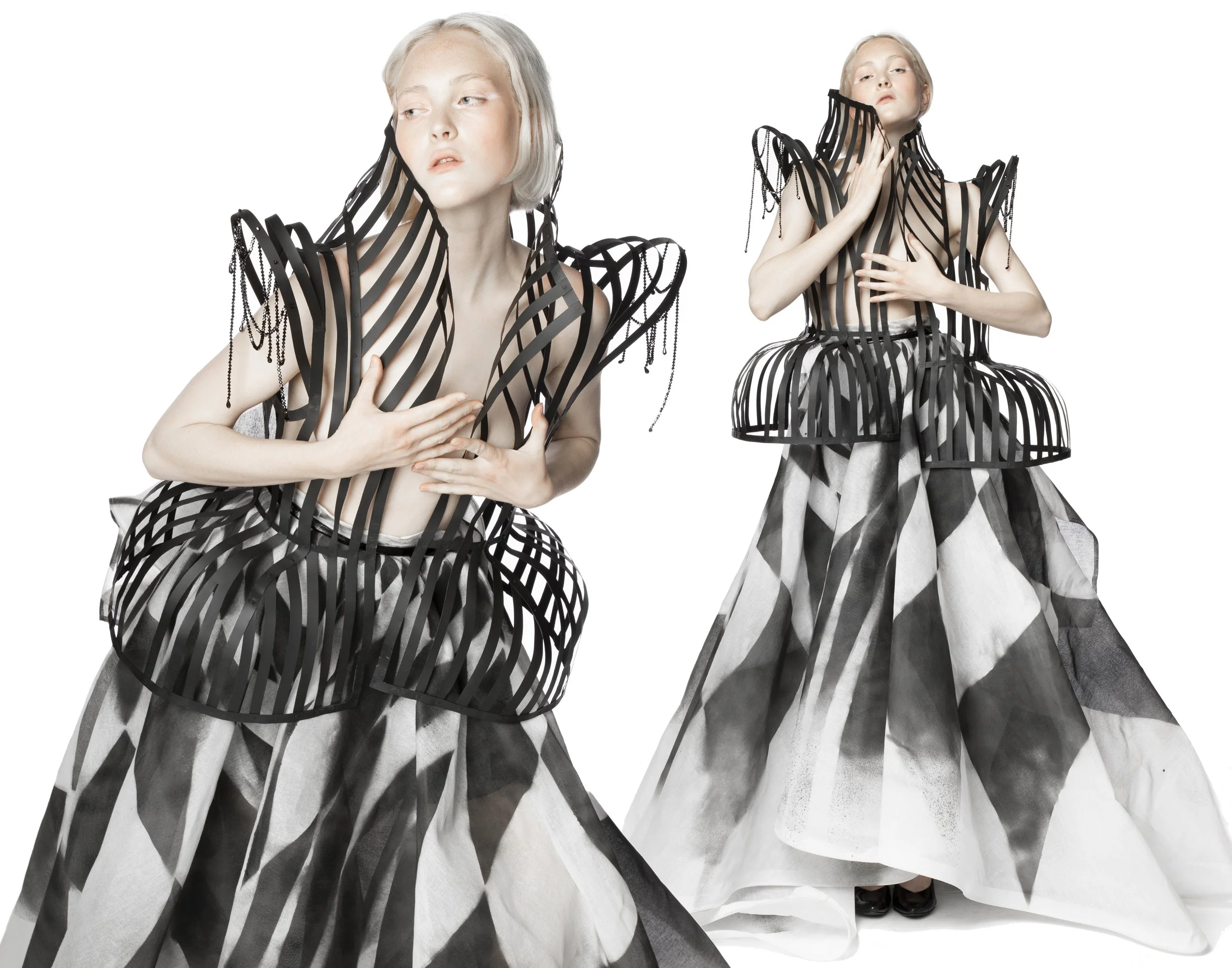 The cage, first modeled in cardboard, then welded in metal, is meant to resemble the silhouette of armory while simultaneously begging the question of imprisonment, like a bird in a cage.